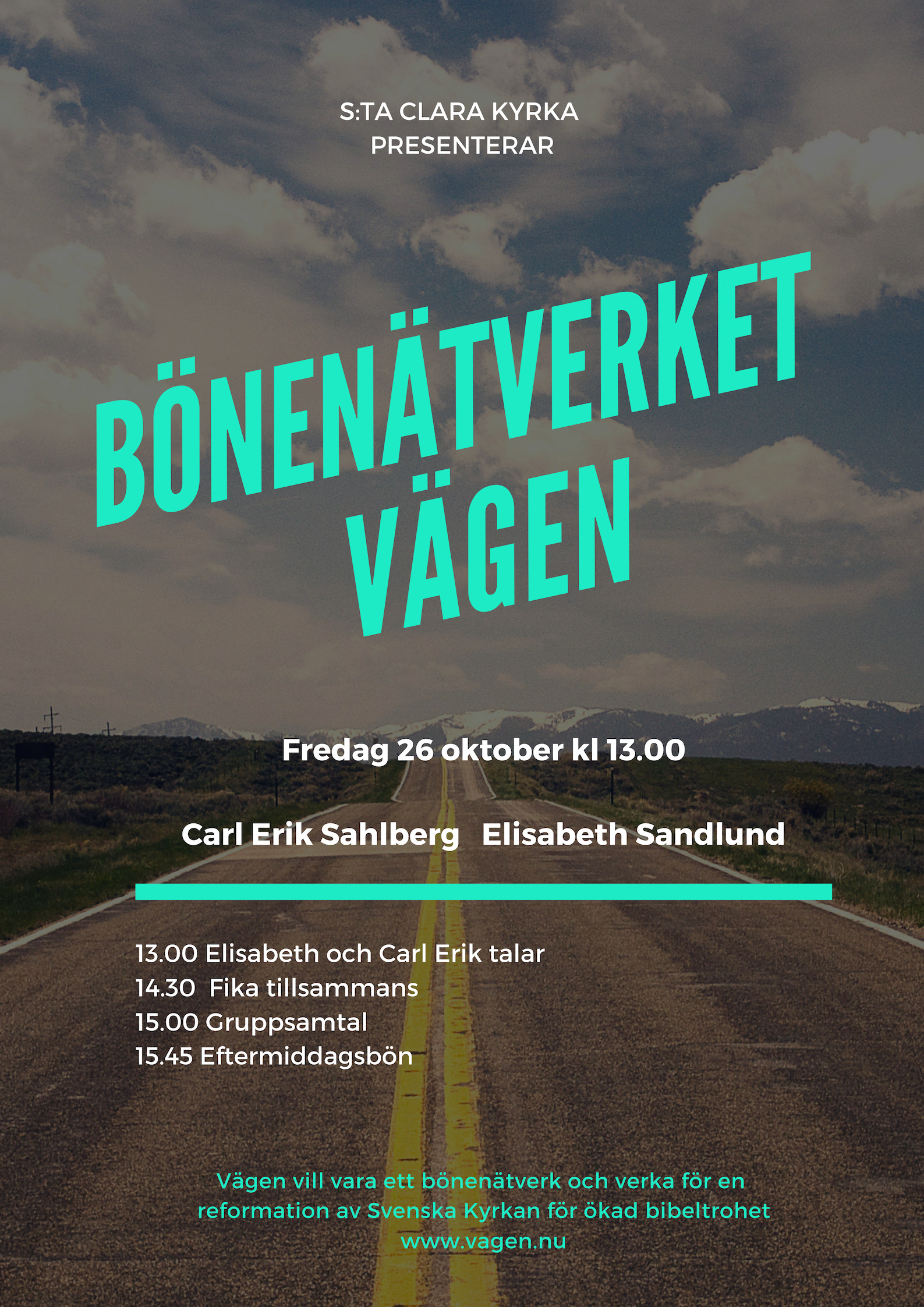Nu gör vi omstart och tar nya tag i förvissning om att nätverket Vägen behövs. Vi vill samla bibeltroende kristna från skilda sammanhang som lokalt, regionalt och nationellt kan stötta varandra. Vi vill på bönens grund och med Guds hjälp arbeta för en reformation av Svenska kyrkan och för mission i Sverige så att fler får del av det glada budskapet om Jesus Kristus.